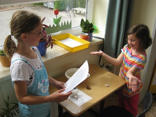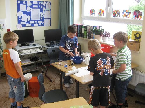 In der Klasse 1b arbeiten die Kinder an ihrer „Wasser-Werkstatt“. Durch einfache Experimente finden sie selbst heraus, welche Dinge schwimmen können, wie man Knete zum Schwimmen bringt oder wie man eine funktionierende Wasserleitung bauen kann. Ihre Erkenntnisse notieren die Kinder in Beobachtungsbögen. An der konzentrierten Arbeitsatmosphäre konnte man gleich sehen: Wasser ist eben ein begeisterndes Element!