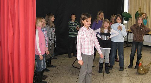 Dank der finanziellen Unterstützung durch den Förderverein konnte ein Theatervorhang angebracht und die Bühnenrückwand mit dunklem Stoff ausgestattet werden. Die Kinder des Theater-WP freut’s…!