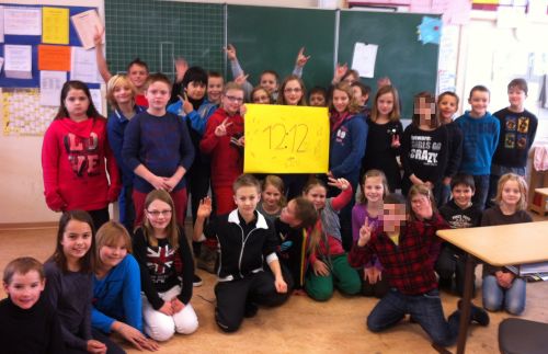Und so versammelten sich am 12.12.’12 um 12:12 Uhr alle zum gemeinsamen Foto rund um das Plakat mit der Aufschrift „Wir waren dabei!“ 😉 Möglicherweise stand bei der Aufnahme des Fotos sogar der Sekundenzeiger auf der 12…! 🙂