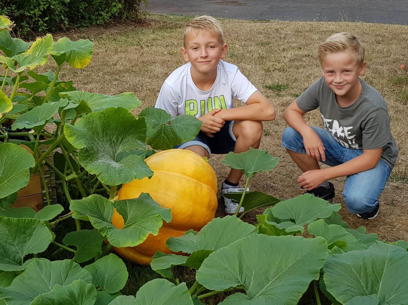 „Unser Kürbis ist groß und er wird von Tag zu Tag immer größer. Und wir machen jeden Tag die gelben Blüten ab, damit sich die ganze Pflanze auf den großen Kürbis konzentriert und er immer größer wird.“