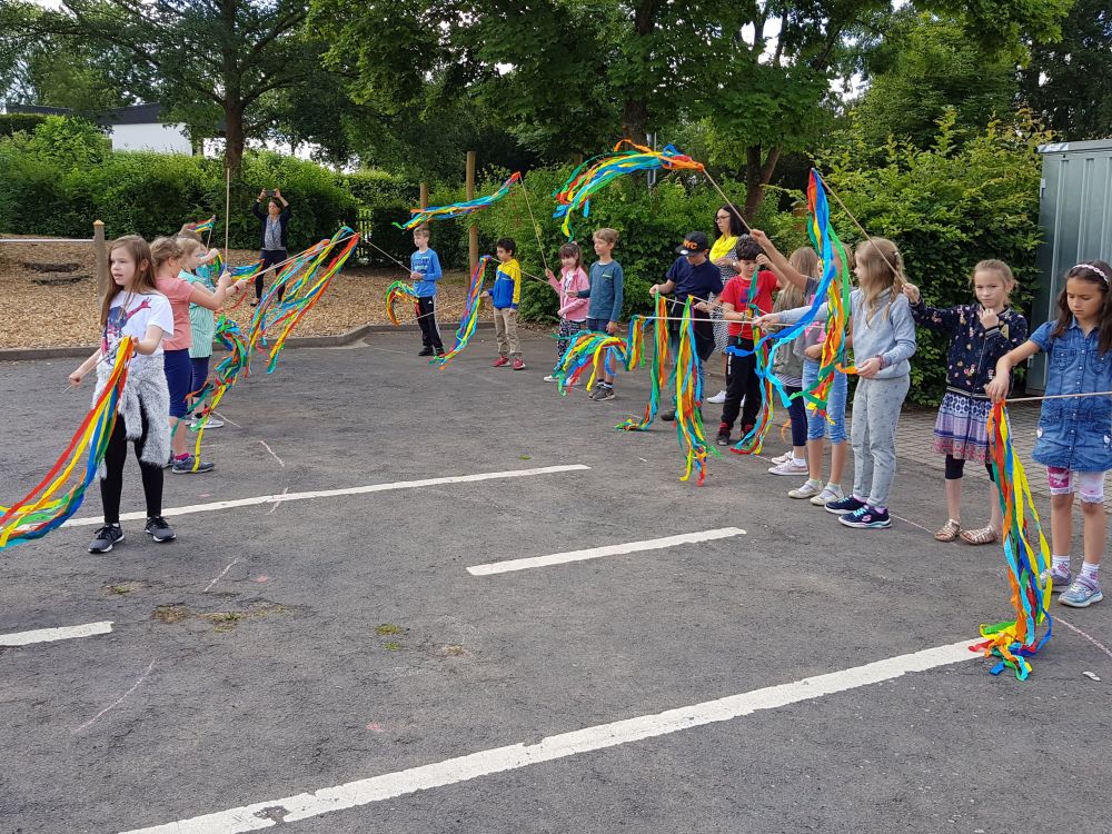 Am Ende des Schultags wurden die Abgänger mit einem besonderen Spalier aus vielen bunten Bändern in Regenbogenfarben von den Mitschülern der ersten bis dritten Klassen verabschiedet. Das war schon sehr emotional…