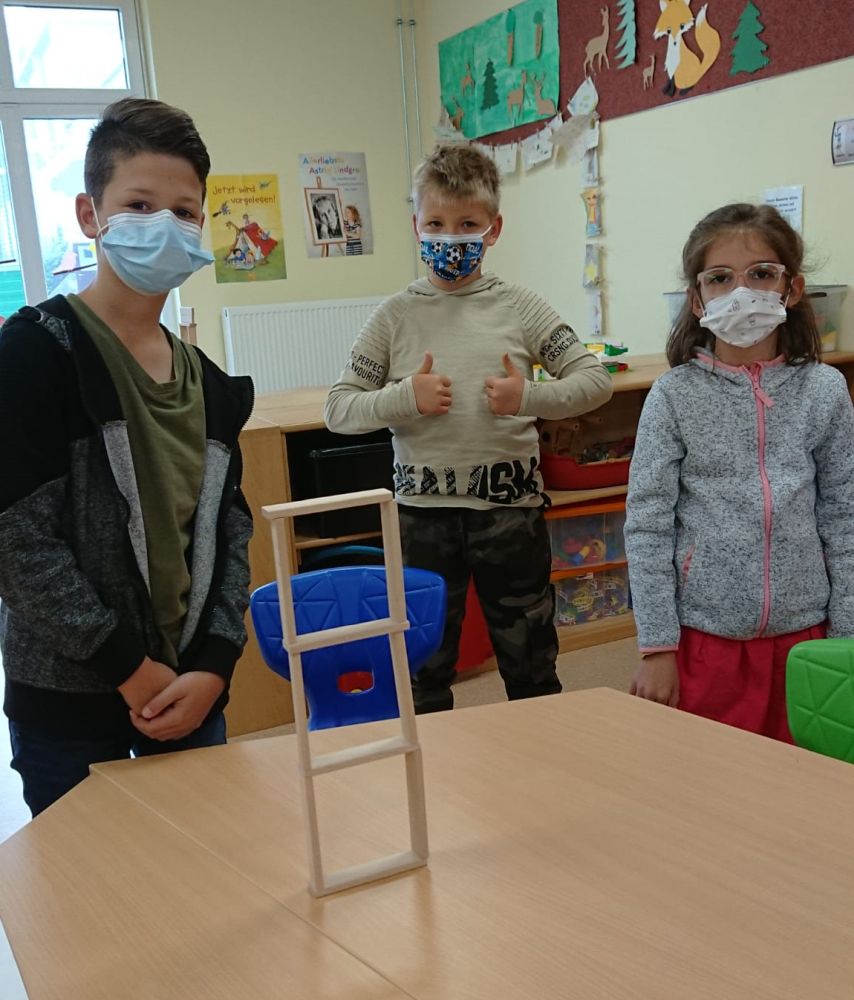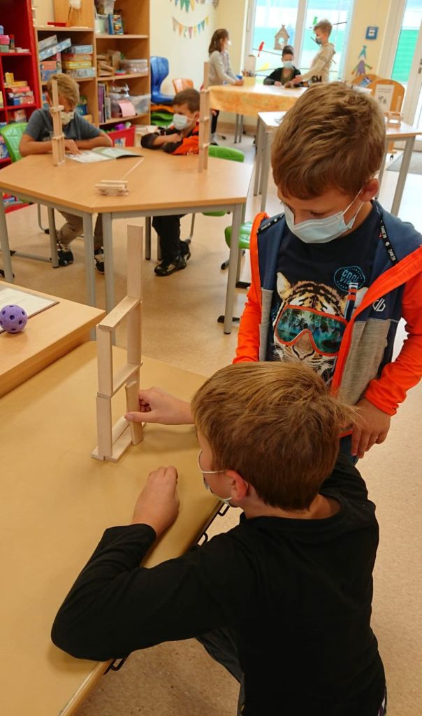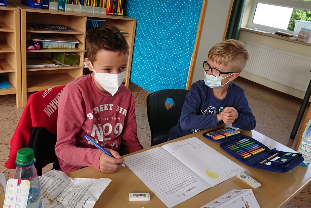 Bereits am Donnerstag der ersten Schulwoche führten wir ein erstes Treffen zum Kennenlernen durch. Die Viertklässler hatten kleine praktische Geschenke für ihre Patenkinder vorbereitet. Nach der Übergabe der Geschenke ging es dann auf einen gemeinsamen Schulrundgang: Im Betreuungsraum bauten die Teams unterschiedlichste Bauwerke aus nur zehn Bausteinen, in der Bücherei wurde vorgelesen, die Haltestelle wurde gezeigt und das Anstellen dort erläutert. Das richtige Händewaschen und die Spielausleihe wurden ausprobiert und auf dem Spielfeld gemeinsam gekickt. Anschließend wurde ein gemeinsamer Eintrag in das Schultagebuch verfasst.
