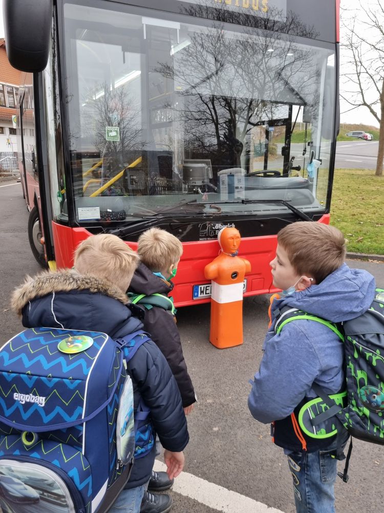 Abschließend wurde auch das Verhalten an der Bushaltestelle vor Ort besprochen. Hier war es sehr interessant, einmal die Perspektive des Busfahrers einzunehmen, um festzustellen: Ein kleines Kind direkt vor einem Bus ist für den Busfahrer völlig unsichtbar.