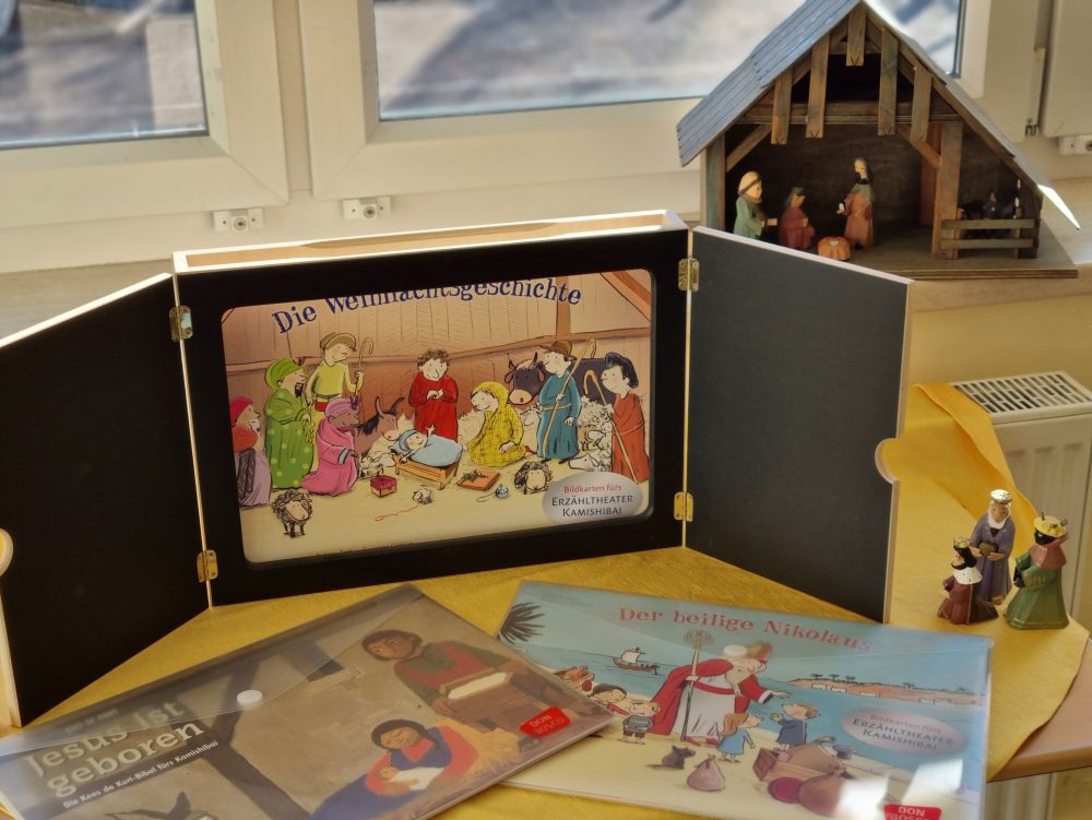 Sehr gerne verwenden wir im Unterricht unser Kamishibai-Erzähltheater, bei dem große Bildkarten im A3-Format für das Erzählen von Geschichten unterstützend eingesetzt werden.