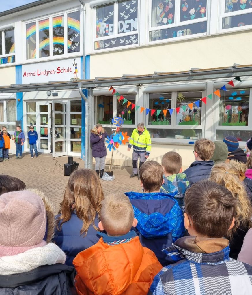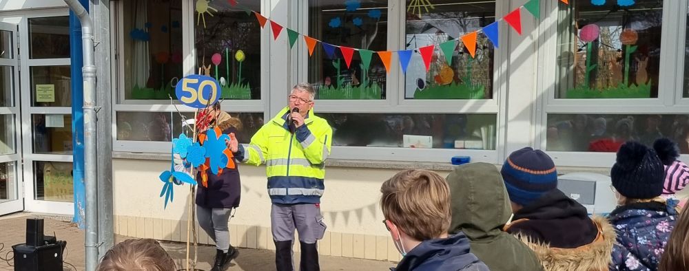Unser Hausmeister Dirk Henkel feierte kürzlich seinen 50. Geburtstag. Daher überraschten ihn die Klassen mit einem Geburtstagslied auf dem Schulhof. Als Geschenk hatten die Schülerinnen und Schüler bunte Blumen vorbereitet, die einen Obstbaum für Herrn Henkels Garten schmückten.