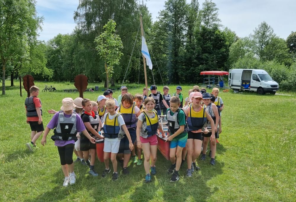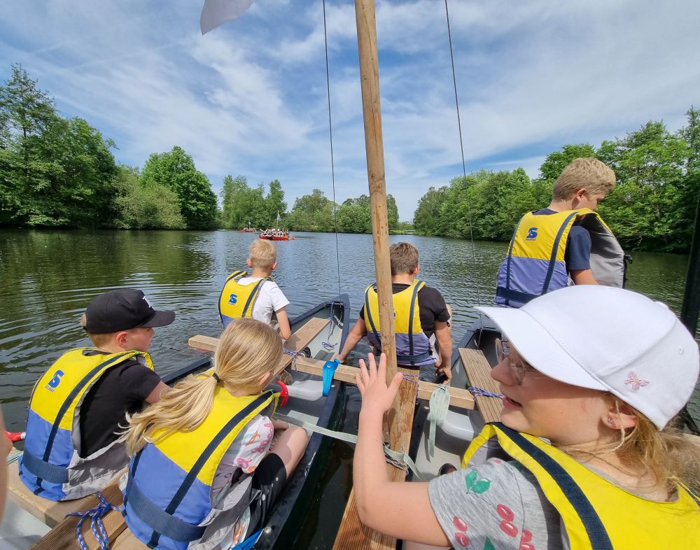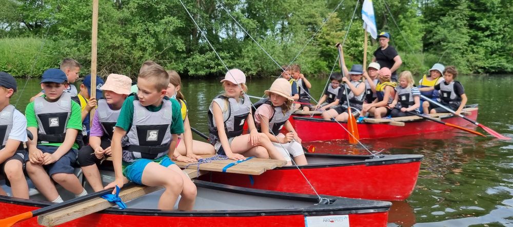 Die beiden vierten Klassen sind zur Zeit auf Klassenfahrt. Heute ging es um ganz spannende Gruppenaktionen. Das absolute Highlight war der Bau von schwimmfähigen Flößen, die so stabil gebaut sein mussten, dass man mit ihnen auch ein Rennen bestreiten und einen Schatz finden konnte. Sensationelle Aktion! Großartige Teamleistungen! 🙂
