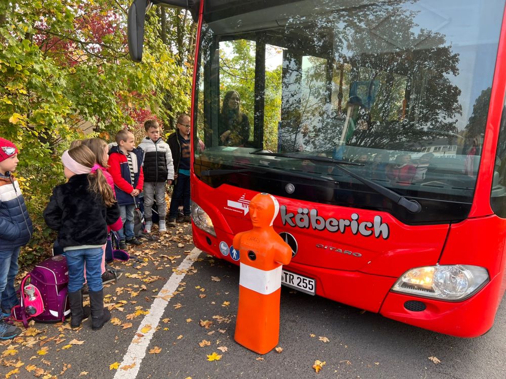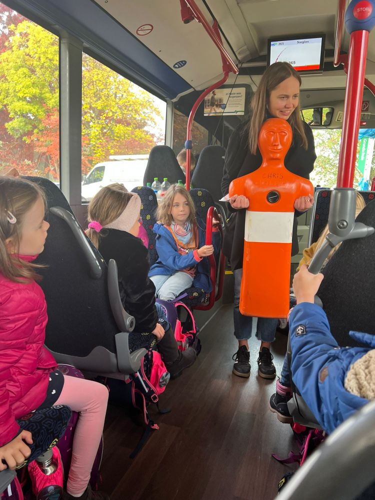 Mit kurzen Notbremsungen im Schulbus wurde den Kindern verdeutlicht, wie wichtig das Festhalten während der Fahrt ist.