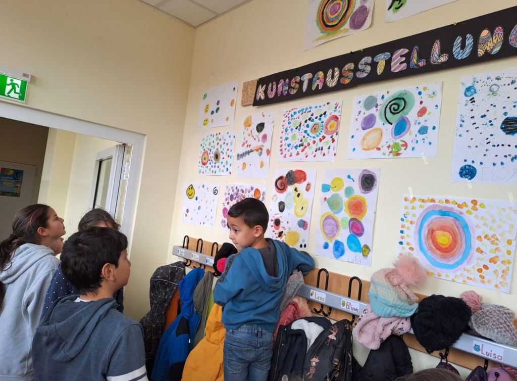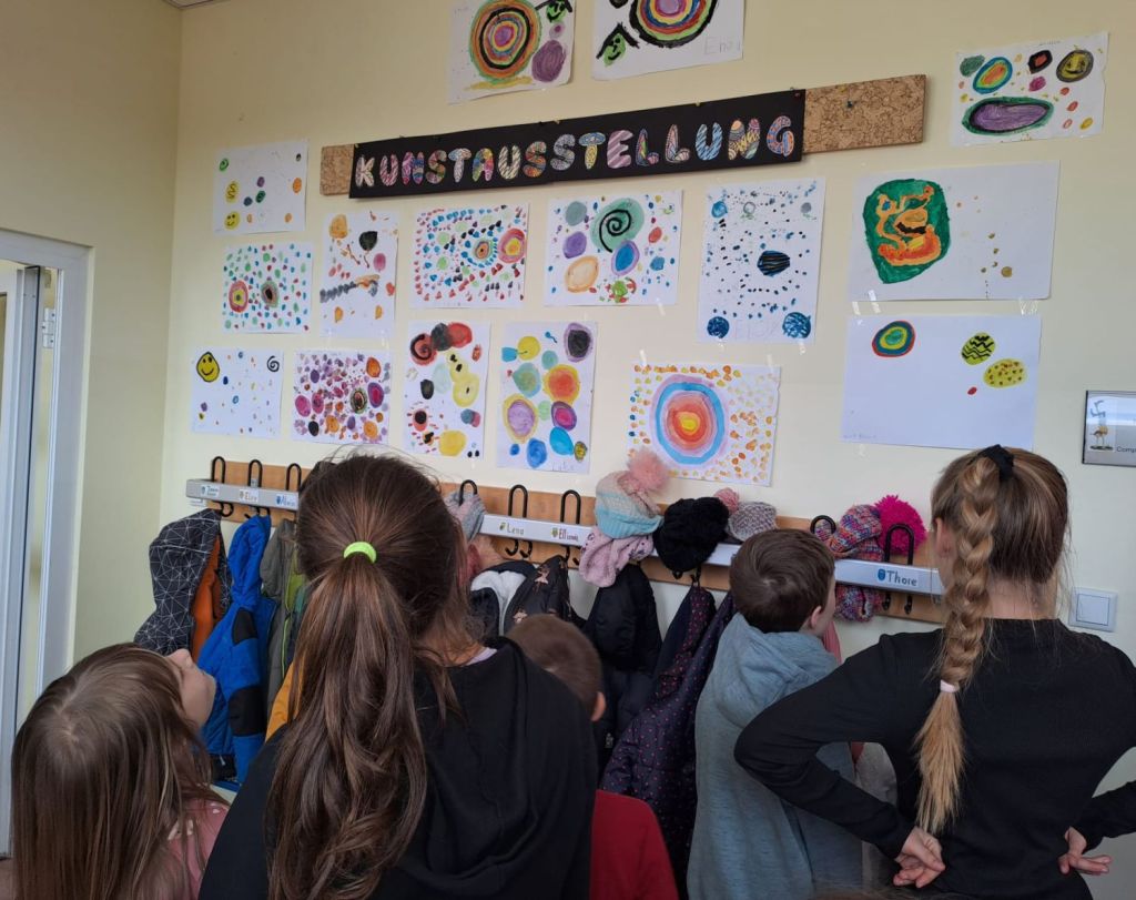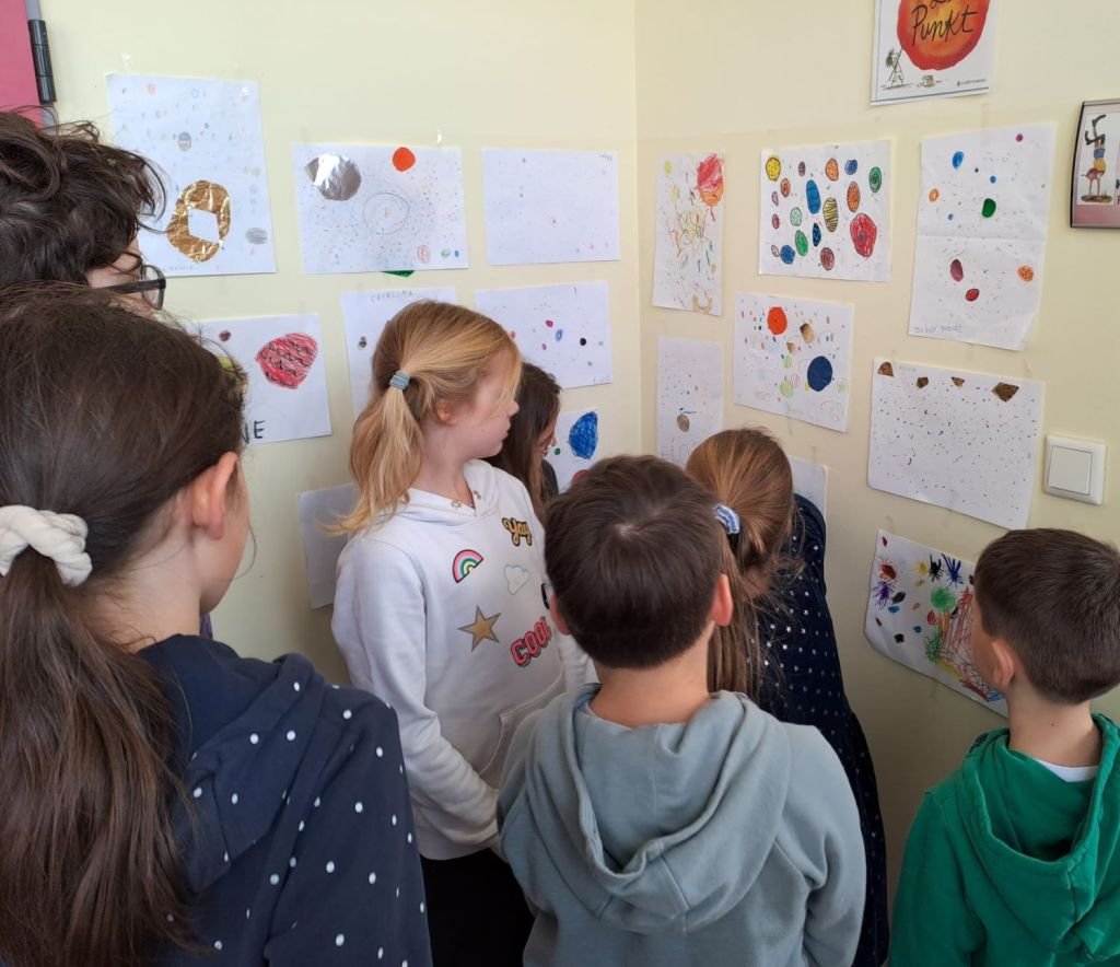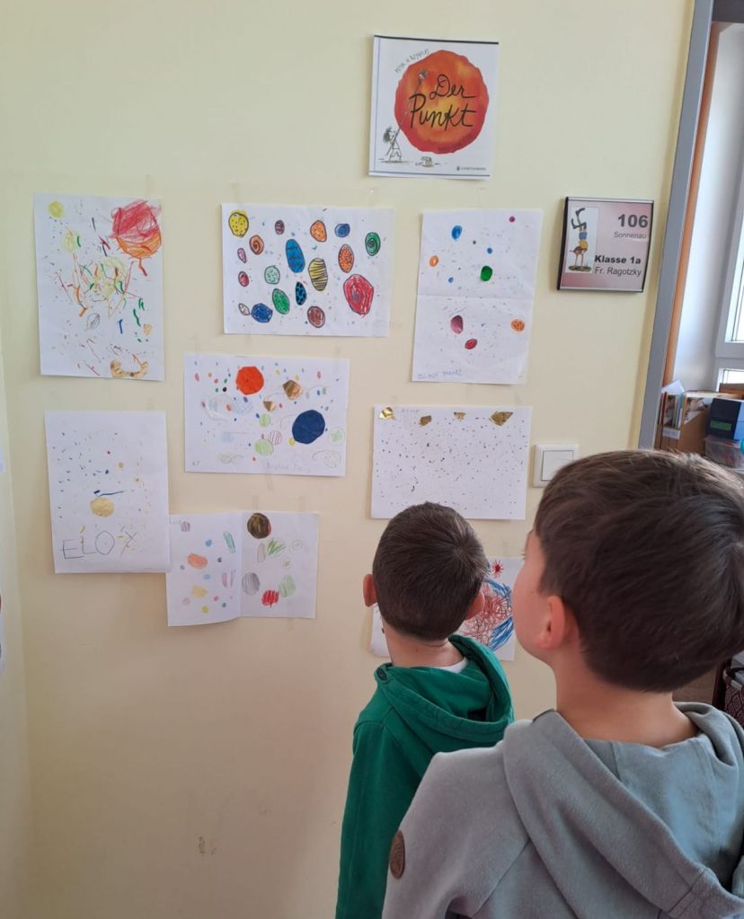 Im Kunstunterricht der Klasse 1a hat unsere Lehrkraft Tanja Sippel den Kindern das Buch „Der Punkt“ von Peter Reynolds vorgestellt. In der weiteren Beschäftigung mit dem Buch haben die Schülerinnen und Schüler passend zum Gehörten sehr kreative und schöne eigene Bilder gestaltet. Gerne wollten sie die Ergebnisse auch ihren Paten aus der vierten Klasse vorstellen. So wurde zur Kunstausstellung eingeladen! Stolz erzählten die Kinder danach, dass sie sehr für ihre Werke gelobt wurden mit Sätzen wie „Das hast du toll gemacht!“ oder „Du bist ein richtiger Künstler!“ Schule kann manchmal so schön sein…! 🙂