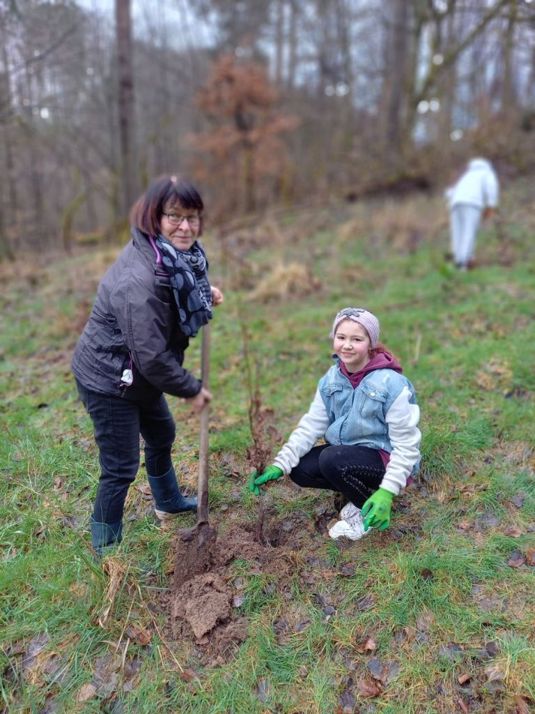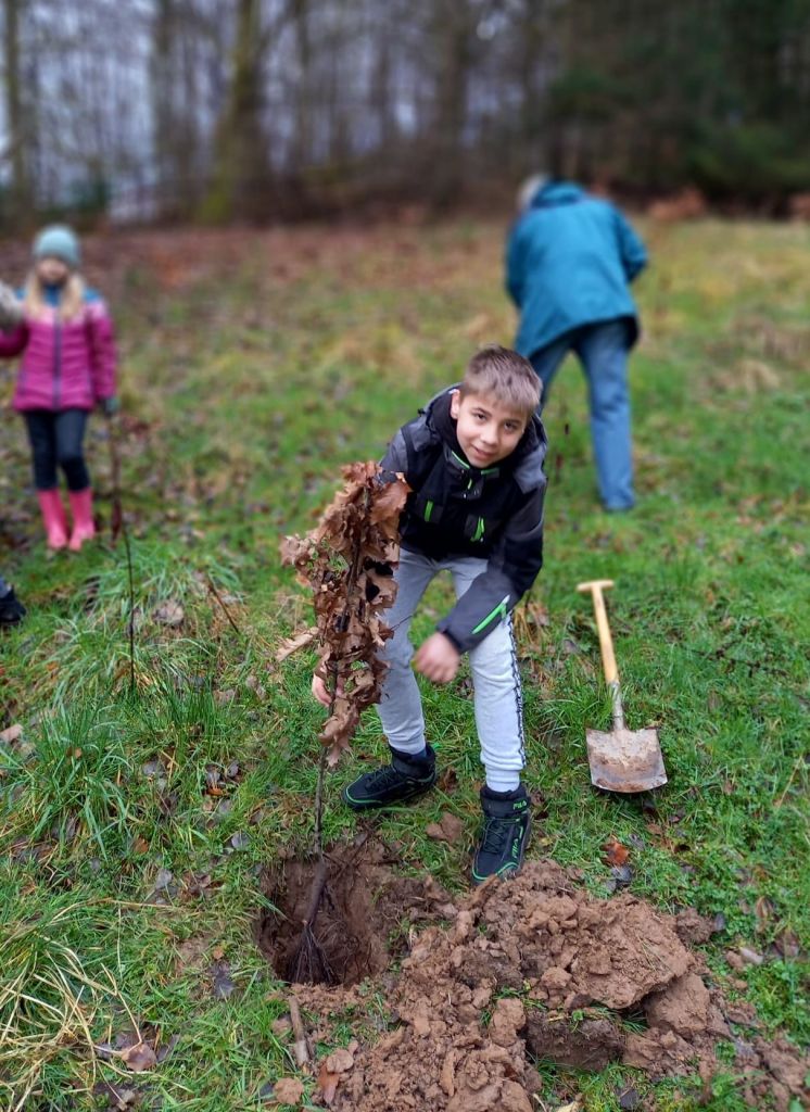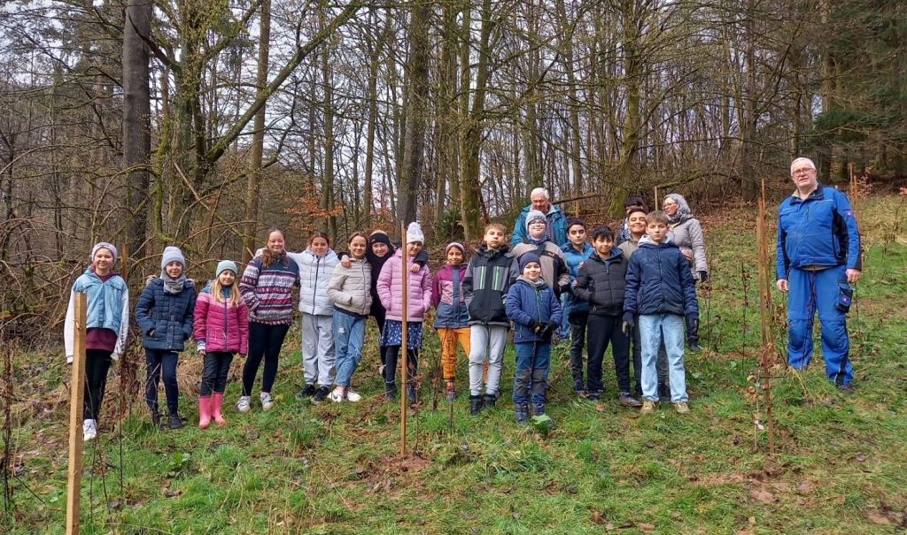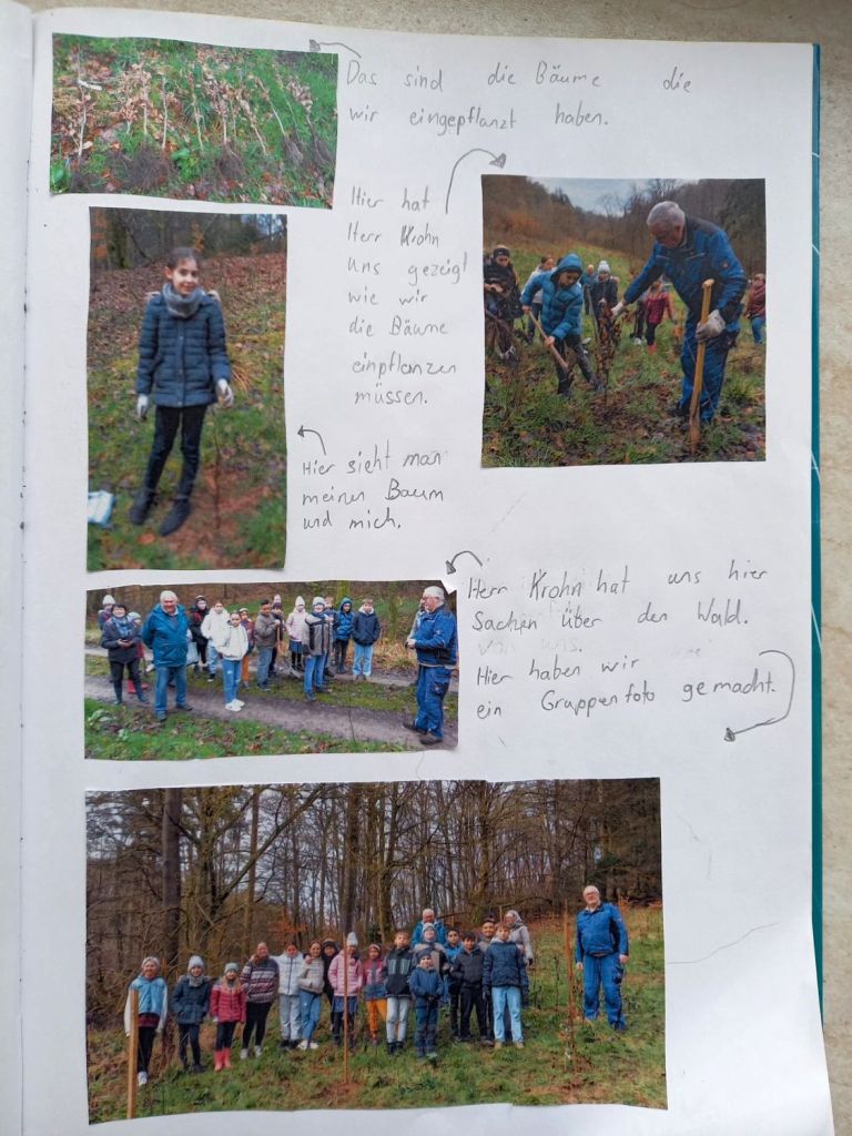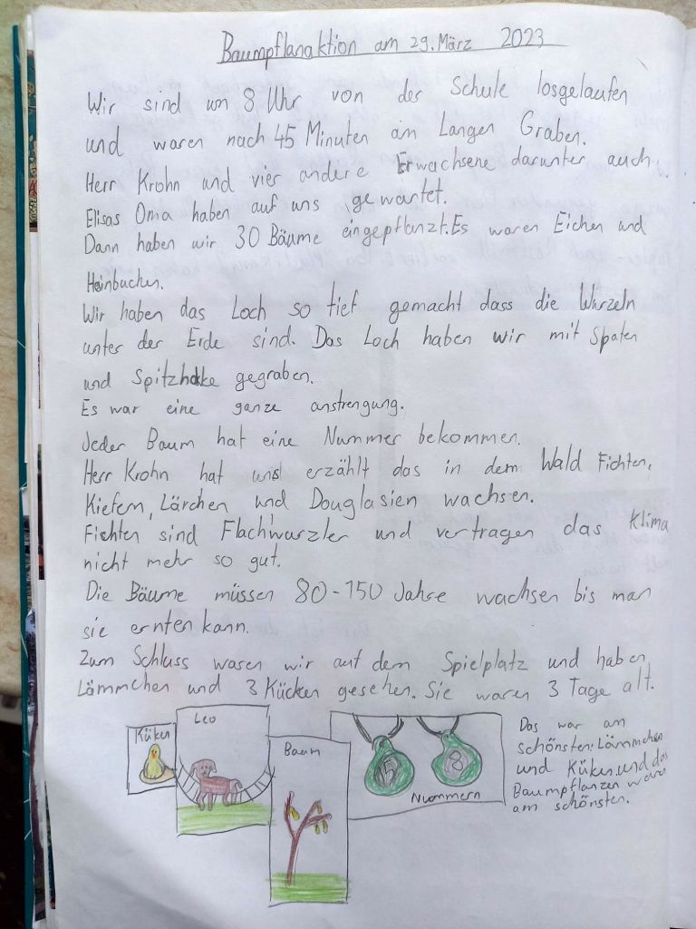 Am 29. März 2023 haben die Kinder der Klasse 4a gemeinsam mit dem Vorsitzenden des „Vereins der Waldinteressierten“ Herrn Krohn und vier anderen Mitgliedern am „Langen Graben“ im Weihersgrund 30 Bäume gepflanzt. Mitgebracht hatten die Vereinsmitglieder junge Hainbuchen und Eichen. Jeder bekam einen Spaten oder eine Spitzhacke und musste ein tiefes Loch graben. Das war ganz schön anstrengend, machte aber auch sehr viel Spaß! Zum Schluss bekam jeder Baum noch eine Plakette mit einer Nummer, sodass jedes Kind in Zukunft seinen Baum „besuchen“ kann. Aufgrund des Klimawandels ist diese Aufforstung besonders wichtig, denn die Fichten mit ihren flachen Wurzeln vertrocknen entweder, weil sie nicht genügend Wasser bekommen oder werden von Stürmen umgeweht. Die Laubbäume haben tiefe Wurzeln und können deshalb besser Stürme und Hitze aushalten. Es war eine tolle Aktion, die von Frau Hoßfeld organisiert wurde! An dieser Stelle nochmal ein ganz herzliches Dankeschön für die Organisation! Und ein ganz herzliches Dankeschön an Herrn Krohn und die anderen Mitglieder des Vereins! Nun sind die Schülerinnen und Schüler gespannt, ob die Bäume angehen…