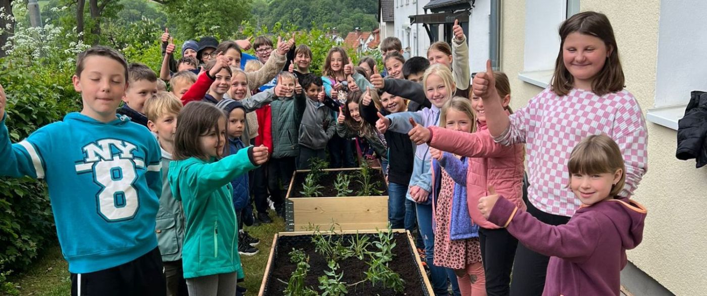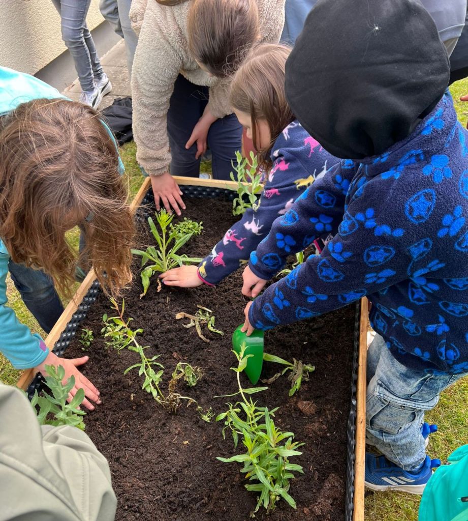 Gemeinsam bepflanzten sie zwei Hochbeete mit nektarreichen Staudenpflanzen, die als Bienenweide dienen sollen. Gemeinsam werden nun Gießdienste übernommen, damit Blutweiderich, Natternkopf, Hohe Fetthenne und Polster-Dost auch gut anwachsen können. 🙂
