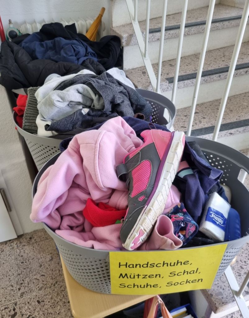 Unsere Kisten mit Fundsachen – hauptsächlich Jacken, Mützen und andere Kleidungsstücke – fließen wieder einmal über. Zum Beginn der Sommerferien werden wir die Kisten leeren und brauchbare Stücke einem wohltätigen Zweck zukommen lassen.