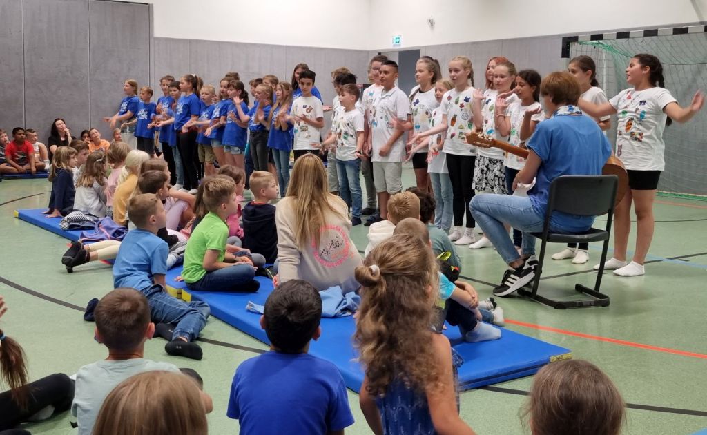 Am letzten Schultag trafen wir uns – wie jedes Jahr – zur Vollversammlung. Da das Bürgerhaus belegt war und es für eine Open-Air-Veranstaltung zu regnerisch war, funktionierten wir kurzerhand die Turnhalle zur Aula um. Dank der kürzlich erfolgten akustischen Sanierung der Hallendecke war dies auch problemlos möglich!