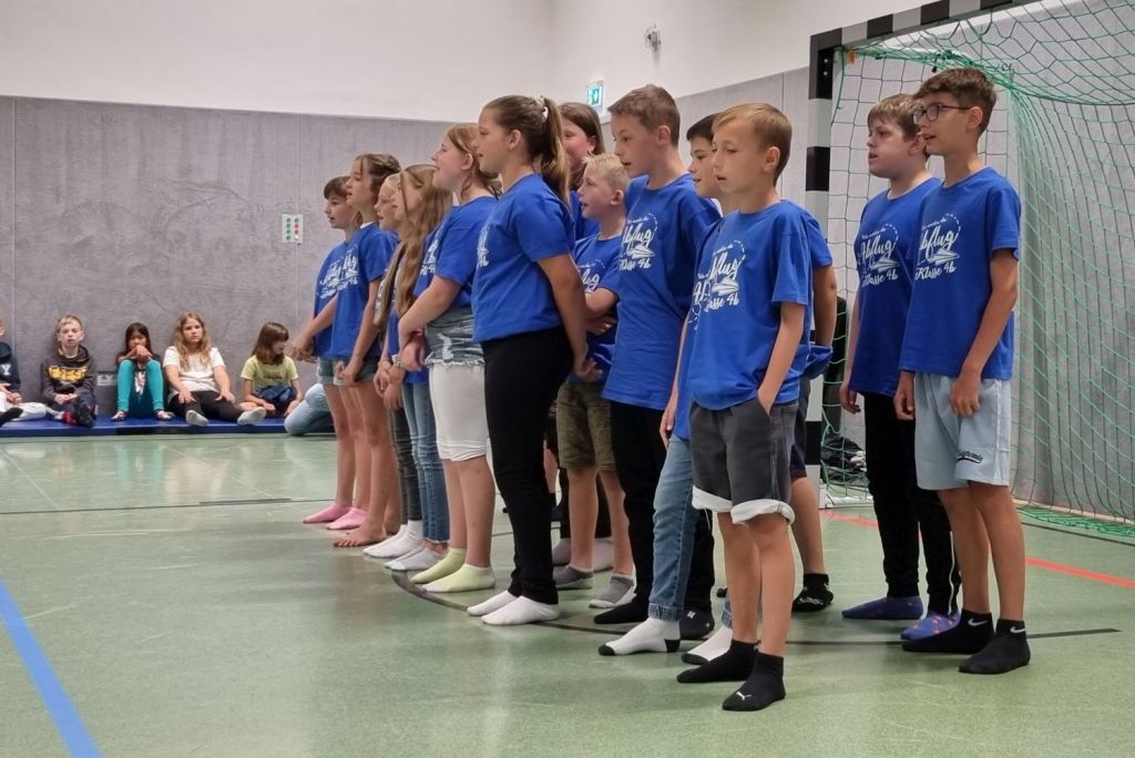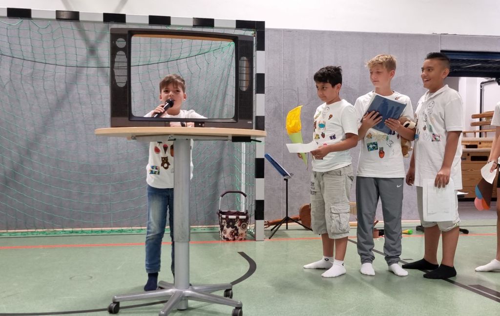 Den Hauptteil machte aber die Verabschiedung der Viertklässler aus, die sich Lieder und eine Nachrichtensendung für ihren Abschluss überlegt hatten.