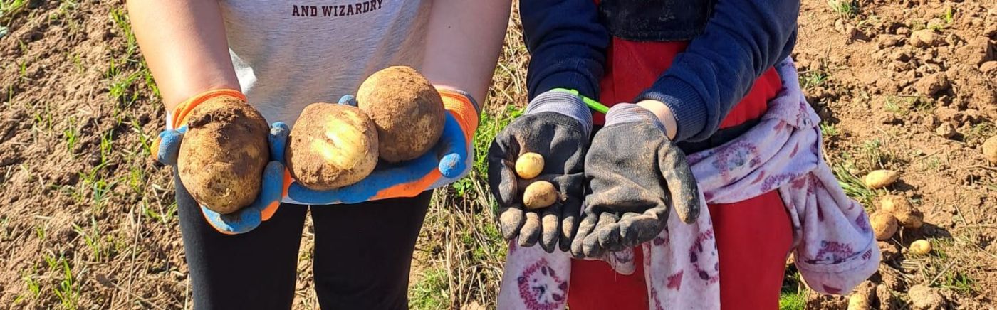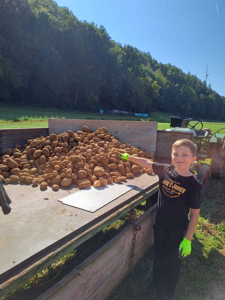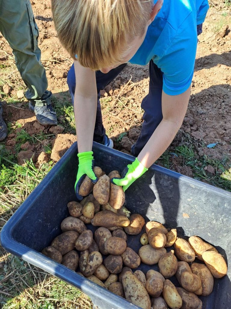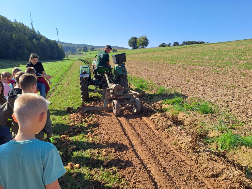 Das Ziel der Wanderung war ein kleiner Kartoffelacker. Dort beobachteten die Kinder, wie Kartoffeln mit einem Kartoffelroder aus der Erde geholt werden. Anschließend wurden die Kartoffeln aufgelesen. Die Schülerinnen und Schüler der 3b haben natürlich fleißig geholfen und viele interessante Funde entdeckt: Winzige und große, dicke und dünne, herzförmige und löchrige.