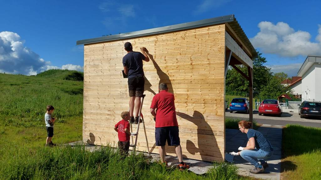 Der neue Holz-Pavillon auf der Naturwiese hinter der Kinderkrippe benötigte noch dringend einen Holzschutz-Anstrich. In einer beeindruckenden Elternaktion wurde dies am Samstag vor Pfingsten „gewuppt“.