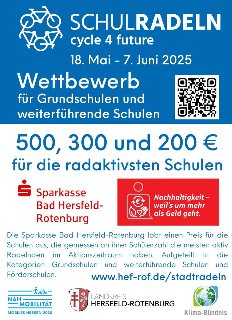 Im Mai startet das kreisweite SCHULRADELN in allen Städten und Gemeinden des Landkreises Hersfeld-Rotenburg. Vom 18. Mai bis zum 7. Juni sind alle dazu aufgerufen, möglichst viele Wege klimafreundlich mit dem Rad zu erledigen.