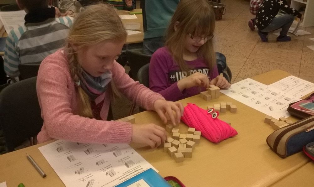 Entstanden sind dabei Kantenmodelle, sowie verschiedene Körper aus Knete. Ebenso wurden Baupläne für Würfelgebäude entwickelt und nachgebaut. In der „Lernwerkstatt“ konnten die Würfelgebäude am PC untersucht werden.