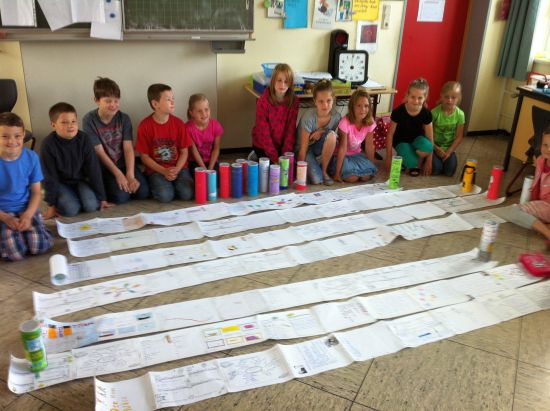 Alle Ergebnisse wurden dann mit Klebeband miteinander verbunden und in die bunt gestaltete Leserolle gesteckt. Für das Foto haben einige Kinder der Klasse 3 den Inhalt ihrer Leserolle noch einmal ausgebreitet.