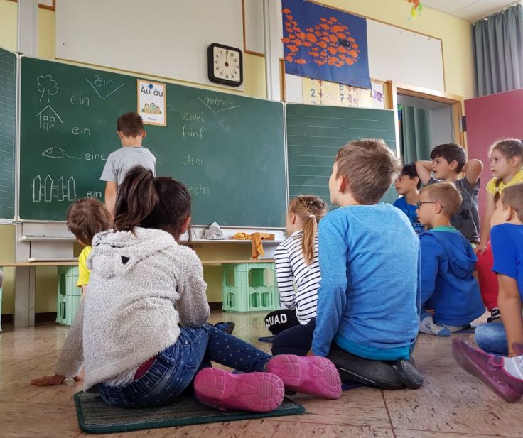Das schöne, frühlingshafte Wetter nutzte heute die Klasse 1a mit ihrer Klassenlehrerin Edda Ruch, um den Deutschunterricht einfach mal auf den Schulhof zu verlegen.