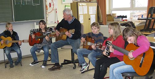 Damit man den Klang und die Art der Tonerzeugung nicht nur von Arbeitsblättern und mithilfe von Hörbeispielen auf CDs kennenlernen musste, lud die Klasse kurzerhand Herrn Nothbaum von der Kreismusikschule in den Unterricht ein.