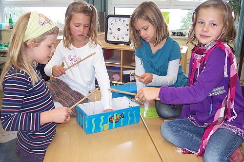 Eine besonders schöne Atmosphäre herrschte in einer der letzten Religionsunterrichts-Stunden der Klasse 4: Im Rahmen eines „Schöpfungsfestes“ wurde die Geschichte von der Schöpfung der Erde aus dem ersten Buch Mose feierlich vorgelesen, während eine Gruppe die einzelnen Szenen mit bunten Tüchern bildlich darstellte und eine weitere Gruppe den Text mit passenden Klängen auf verschiedenen Instrumenten begleitete.